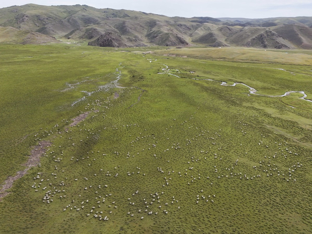 An aerial drone photo taken on July 16, 2025 shows a grassland by the Duku Highway in Northwest China's Xinjiang Uygur autonomous region. [Photo/Xinhua]