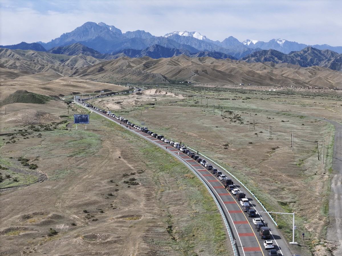 An aerial drone photo shows vehicles on the Duku Highway in Northwest China's Xinjiang Uygur autonomous region, July 15, 2025. [Photo/Xinhua]