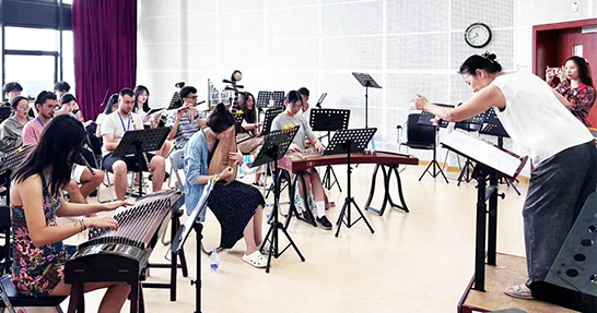 Students learn to play traditional Chinese instruments during the 10th edition of International Institute of Chinese Music Culture. [Photo provided to China Daily]