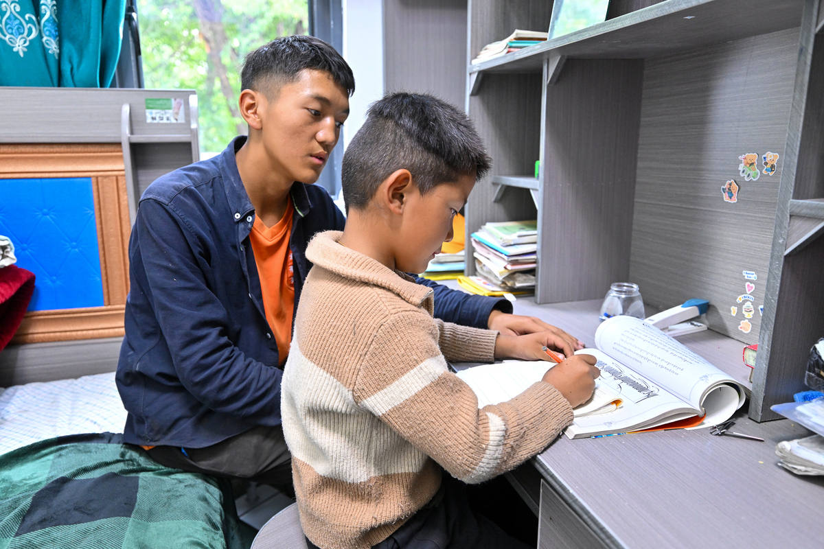 Migmar Cering (L) helps his brother on his homework at their new house in Lnadingxooi village, Zhomda township, Nang county of Southwest China's Xizang autonomous region, July 21, 2025. [Photo/Xinhua]