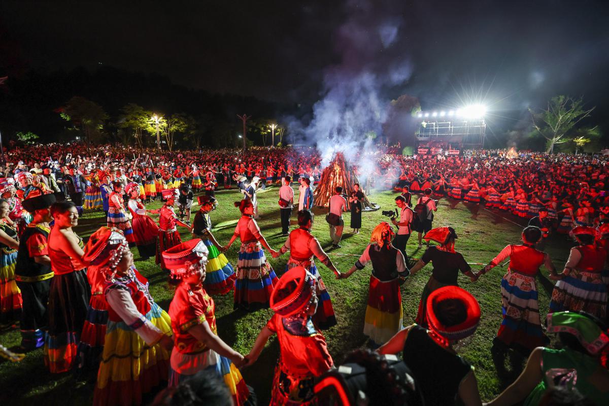 Visitors and locals raise torches and gather around a central bonfire to celebrate in Bijie, Guizhou province. [Photo by Chen Xi/For chinadaily.com.cn]