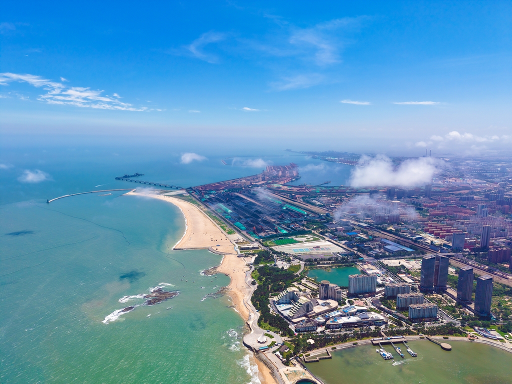 Check out the breathtaking coastal beauty of Rizhao, Shandong province! From above, the blue sky and clouds merge with the emerald sea, while golden beaches wrap around the coastline like silky ribbons. White sailboats dot the crystal-clear waters, leaving sparkling trails behind.