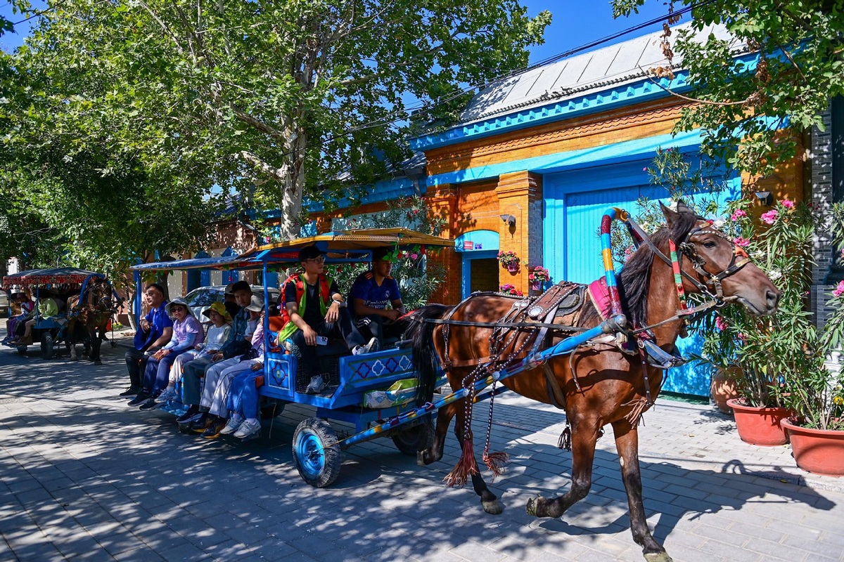 Tourists ride in a horse-drawn carriage to visit Kazanqi culture tourism area in Yining city, Ili Kazak autonomous prefecture, Northwest China's Xinjiang Uygur autonomous region, July 23, 2025. [Photo/Xinhua]