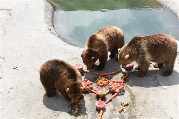 Brown bears beat the heat with frozen fruit at the Harbin Northern Forest Zoo in Heilongjiang province. [Photo by Liu Xiaomi/For chinadaily.com.cn]