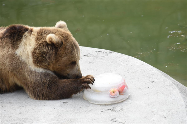 A Brown bear beats the heat with frozen fruit at the Harbin Northern Forest Zoo in Heilongjiang province. [Photo by Liu Xiaomi/For chinadaily.com.cn]