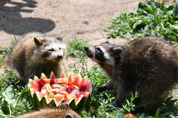Two raccoons beat the heat with frozen fruit at the Harbin Northern Forest Zoo in Heilongjiang province. [Photo by Liu Xiaomi/For chinadaily.com.cn]