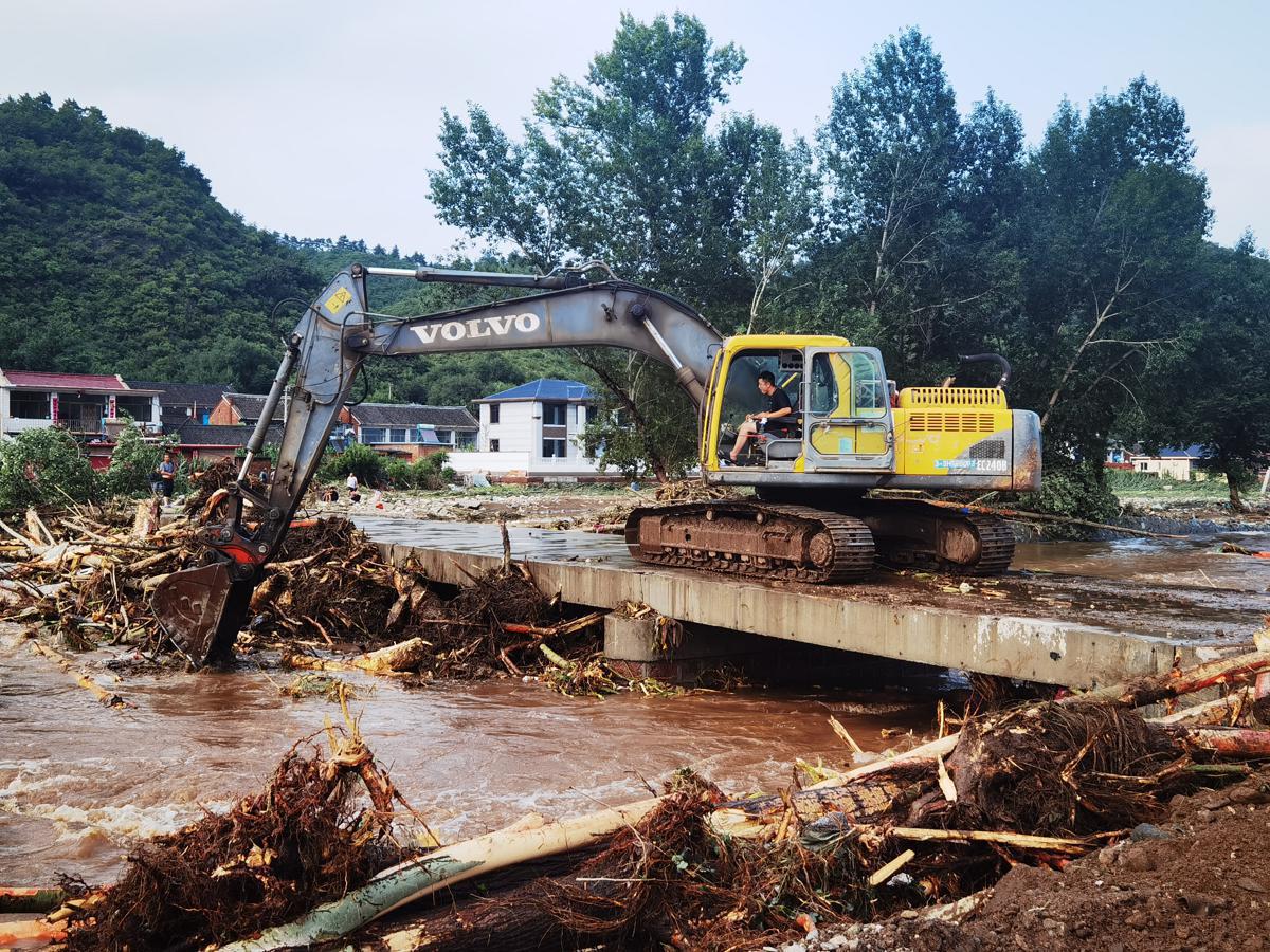 Rescue workers clear a river channel on Monday in Nandamiao village, Luanping county of Chengde, Hebei province. [Photo by Wang Yumin/For chinadaily.com.cn]