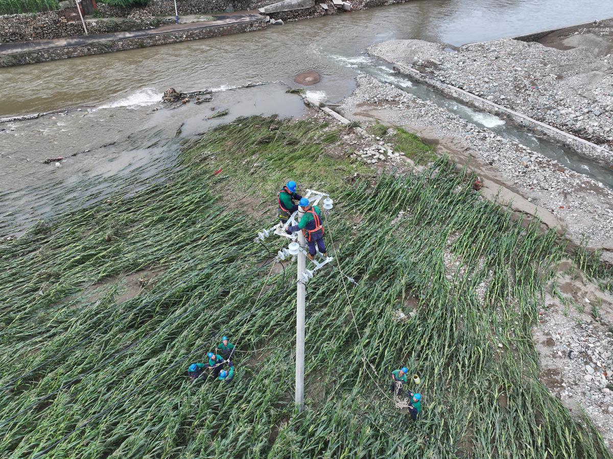 A power emergency team works to restore power facilities on Monday in a township of Luanping county, Hebei province. [Photo by Guo Baoqiang/For chinadaily.com.cn]