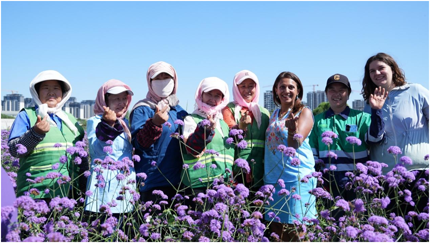 Neeta Vanmari(third from the right) from South Africa and Gabrielle Chen (far right) from the United States take photos with local people at the Zijinyuan Scenic Area in Jinchang, Gansu province on July 25. [Photo provided to chinadaily.com.cn]