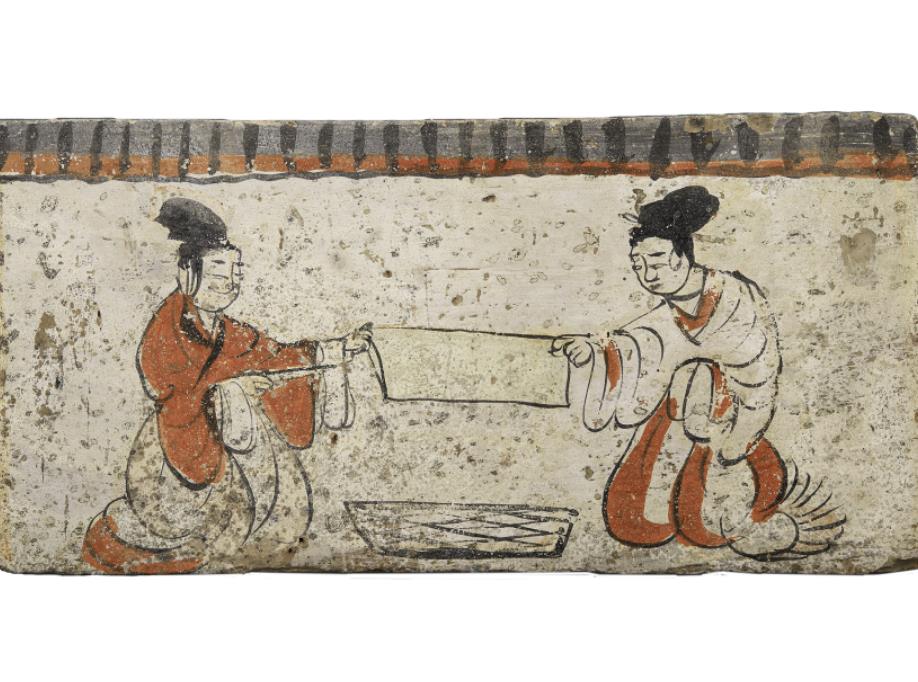 Pictorial brick depicting cutting of cloth, Wei and Jin dynasties (220-420), from the collection of Gaotai County Museum in Zhangye, Gansu province [Photo/Museum of Wu official WeChat account]