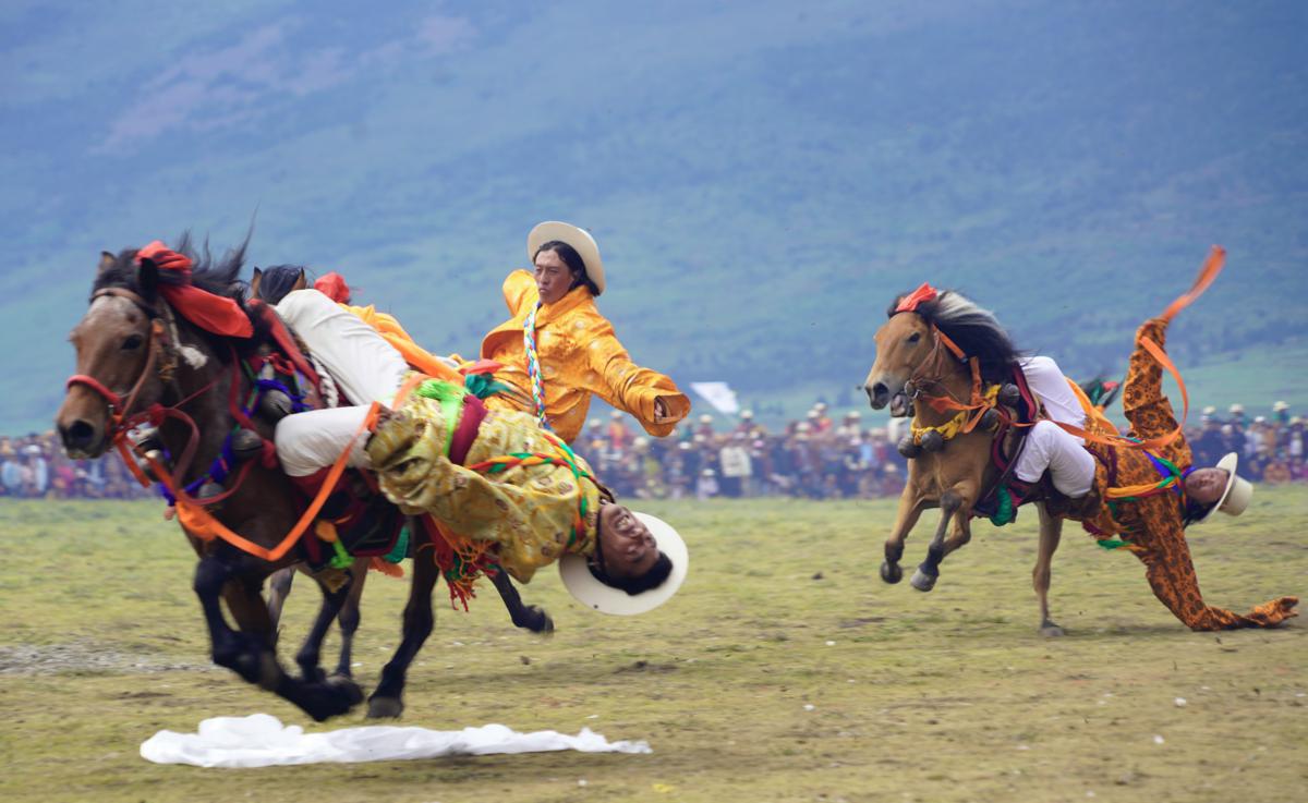 Tibetan herdsmen perform traditional equestrian stunts at a horse racing festival in Litang county, Sichuan province, on Wednesday. [Photo provided to chinadaily.com.cn]
