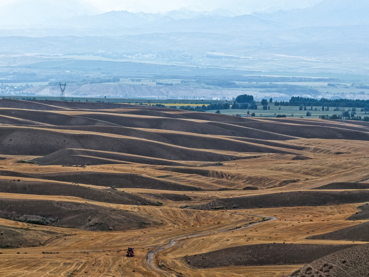 An aerial drone photo taken on July 31, 2025 shows wheat fields in Tekes county, Ili Kazak autonomous prefecture, Northwest China's Xinjiang Uygur autonomous region. [Photo/Xinhua]