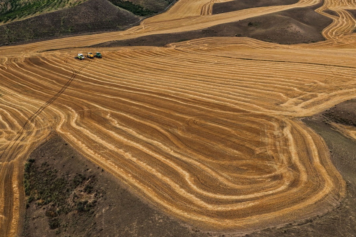 An aerial drone photo taken on July 31, 2025 shows wheat fields in Tekes county, Ili Kazak autonomous prefecture, Northwest China's Xinjiang Uygur autonomous region. [Photo/Xinhua]
