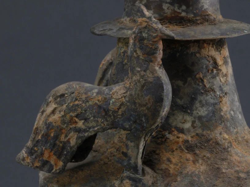 Ancient Dian Kingdom bronze liquor cup decorated with green peafowl