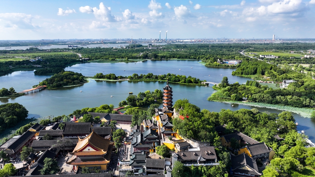At the Jinshan scenic area in Zhenjiang of Jiangsu province, the blue sky, white clouds, and shimmering lake recently created a breathtaking natural landscape. Visitors enjoyed the midsummer beauty by boating across the lake or strolling among the lotus leaves, making the most of the season.