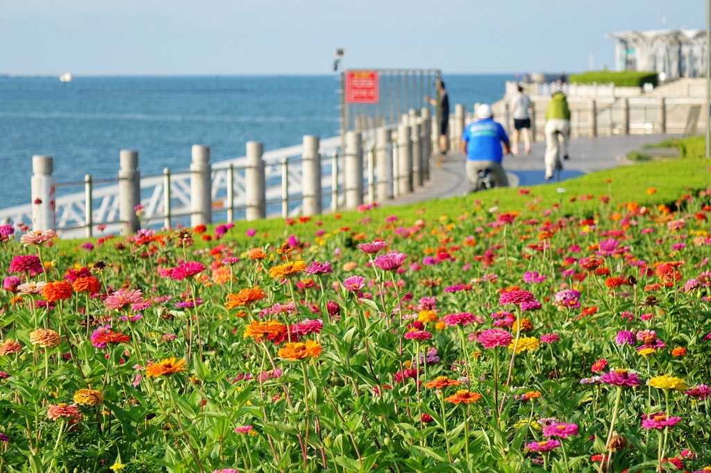 In Qingdao’s Tangdao Bay, vibrant summer flowers bloom, creating breathtaking scenery against the backdrop of the sparkling sea.