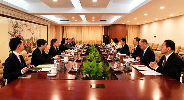 Li Li, commissioner of the National Medical Products Administration (NMPA), met with a delegation led by O Lam, secretary for social affairs and culture of the Macao Special Administrative Region (SAR), in Beijing on July 24.