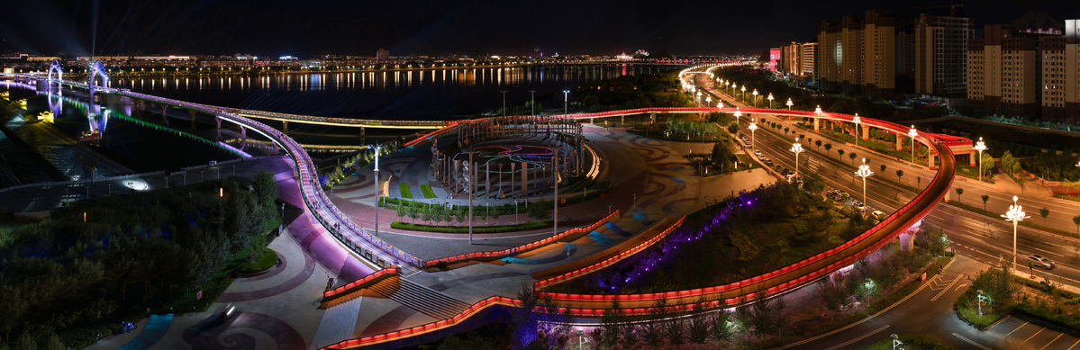 A stitched panoramic aerial drone photo taken on July 30, 2025 shows a bridge over the Lhasa River, in Lhasa, Southwest China's Xizang autonomous region. [Photo/Xinhua]