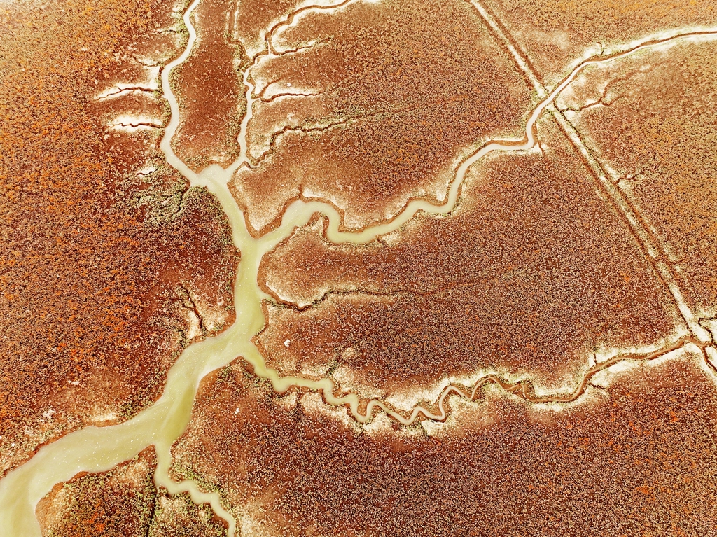 The seepweed at the Yanghe River estuary wetland in Jiaozhou Bay, Qingdao, Shandong province, has turned a vibrant red. The striking contrast of winding waterways and the crimson “carpet” creates a picturesque autumn landscape.