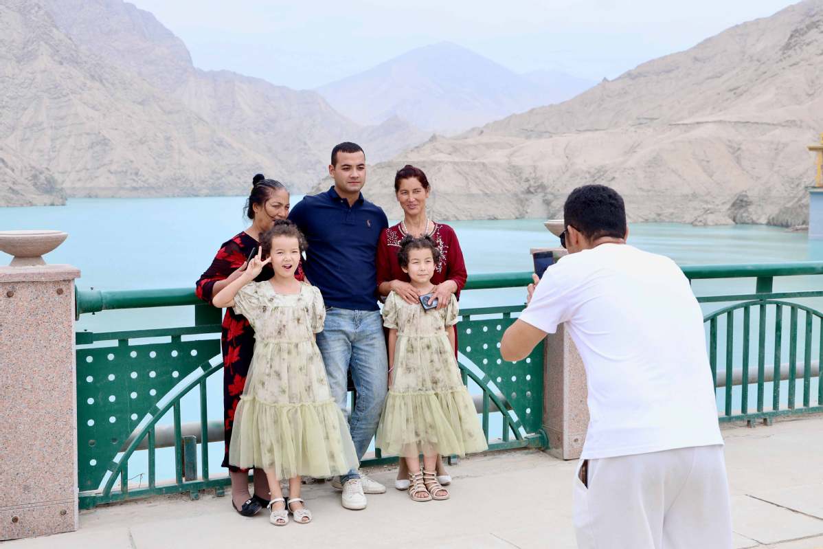 Tourists pose for photos at the Wuluwati Water Conservancy Project in Hotan, Xinjiang Uygur autonomous region, on Aug 6, 2025. [Photo by Li Ziyi/chinadaily.com.cn]