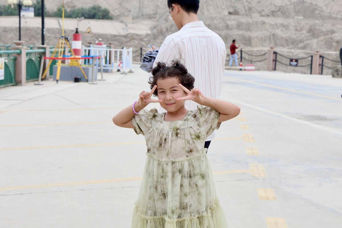 A girl poses for photos at the Wuluwati Water Conservancy Project in Hotan, Xinjiang Uygur autonomous region, on Aug 6, 2025. [Photo by Li Ziyi/chinadaily.com.cn]