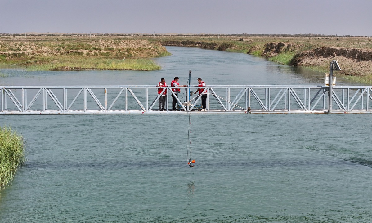 Staff members monitor the discharged flow of water in Yuli county, Northwest China's Xinjiang Uygur autonomous region, on Aug 6, 2025. [Photo/Xinhua]