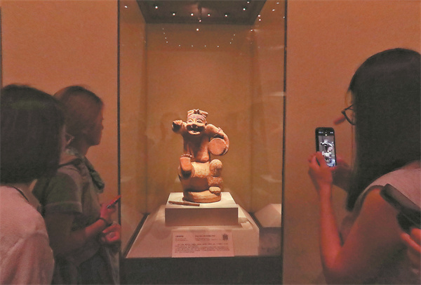 The mini-program Essentiality of Beauty guided tour features a pottery drum-beating storyteller (left) of the Eastern Han Dynasty (25-220).[Photo provided by Jiang Dong/China Daily]