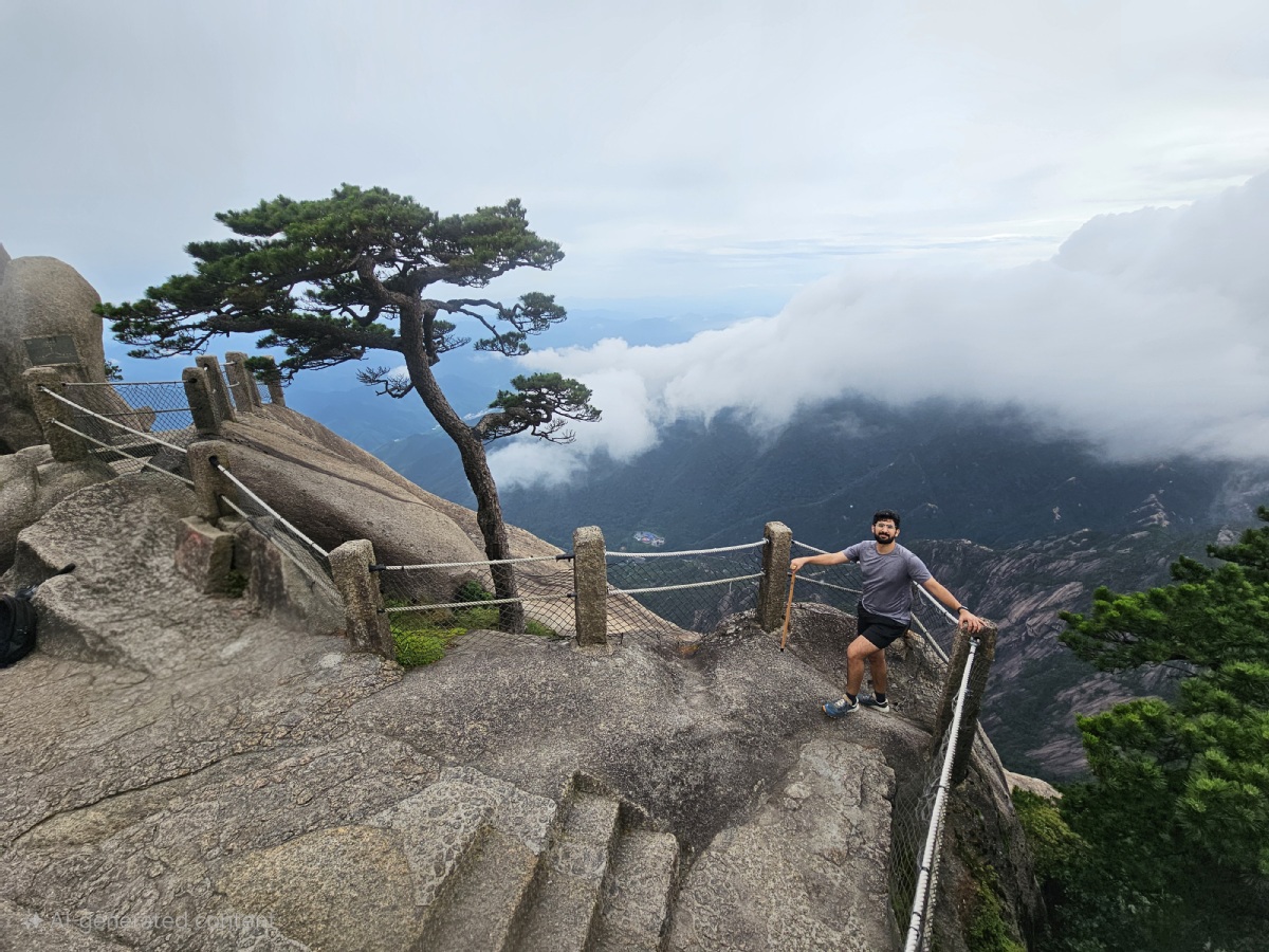 Al-Zouba poses for a photo with the Guest-Greeting Pine, a famous landmark on Mount Huangshan. [Photo provided to chinadaily.com.cn]