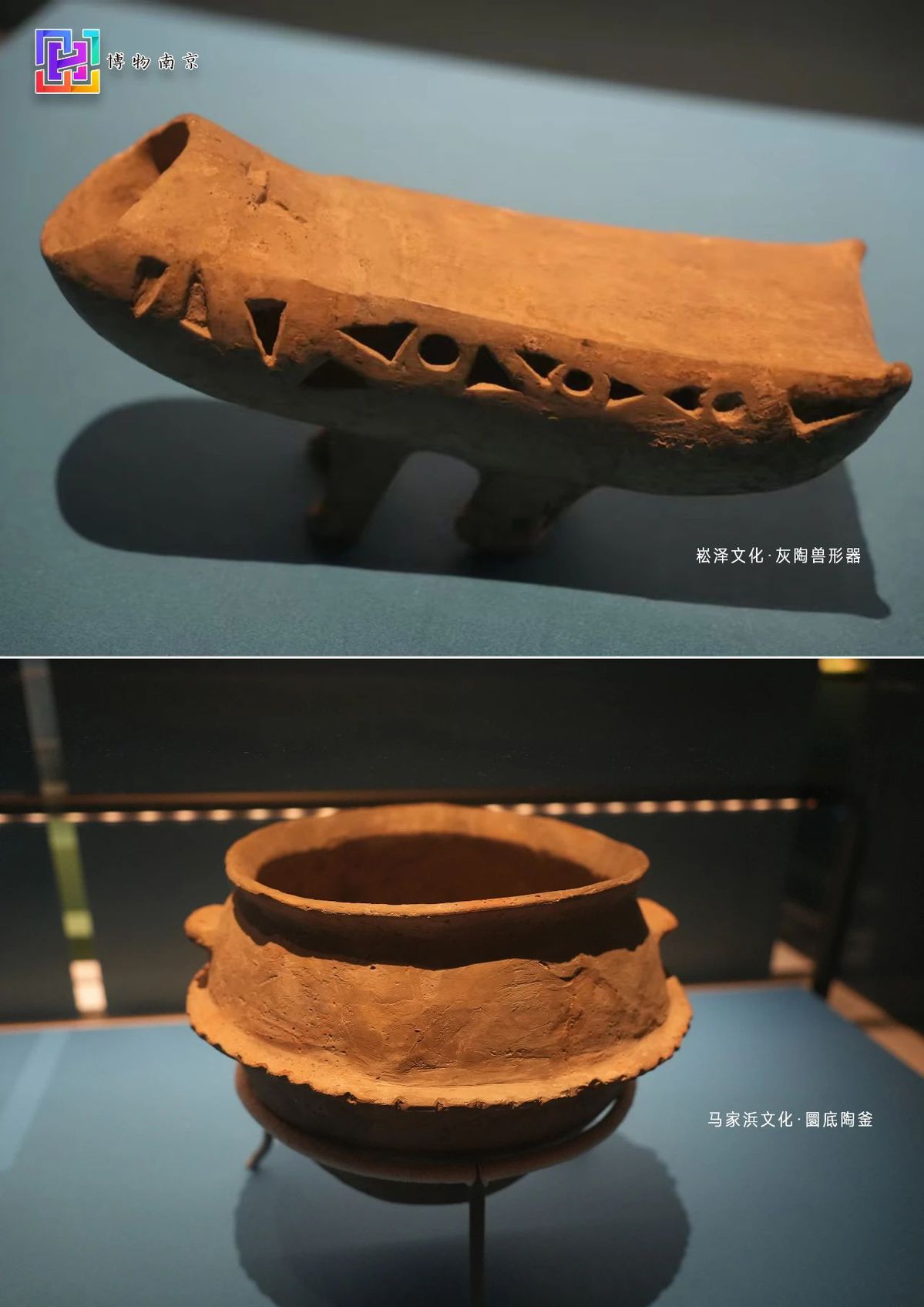 Beast-shaped grey pottery vessel from the Songze culture (top), pottery cauldron with a round base from the Majiabang culture [Photo/Nanjing Municipal Museum official WeChat account]