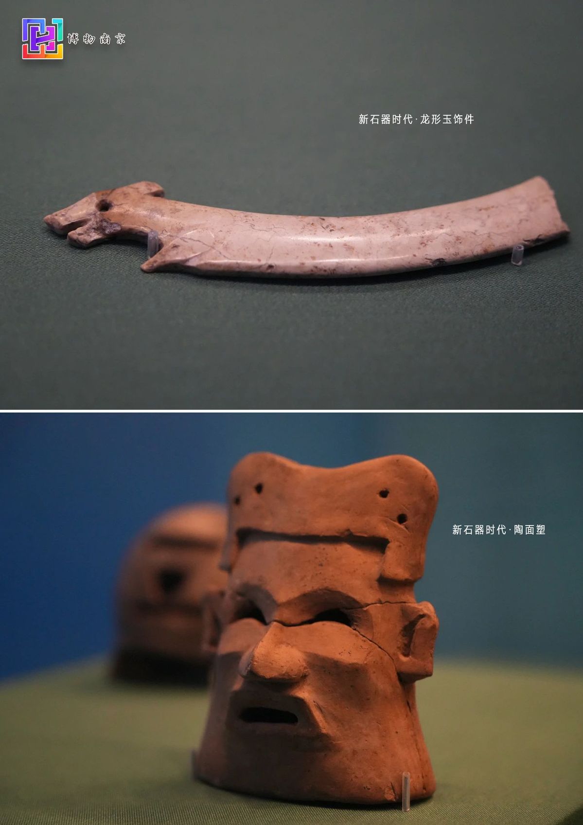Dragon-shaped jade accessory from the Neolithic period (top), pottery sculpture of a human face from the Neolithic period [Photo/Nanjing Municipal Museum official WeChat account]