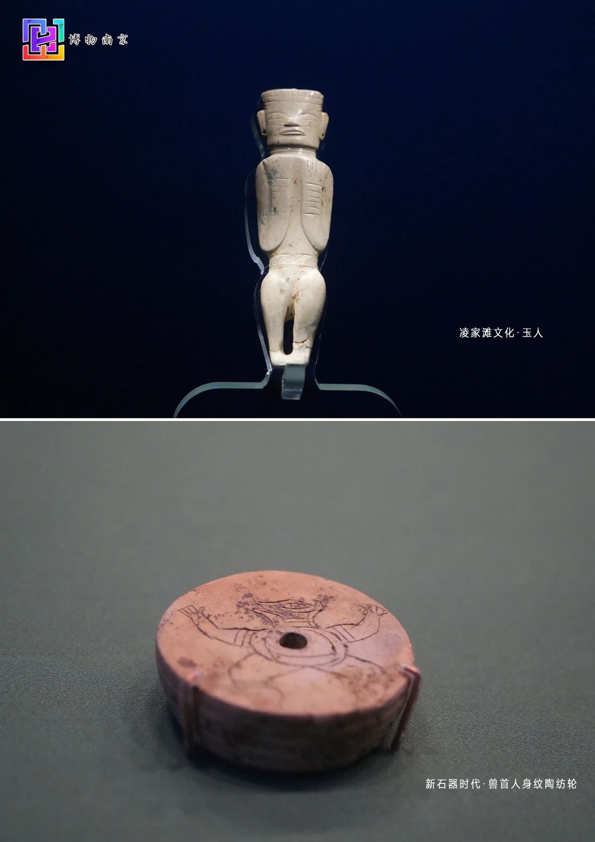 Jade figurine from the Lingjiatan culture (top), pottery spinning wheel with beast-headed man motifs from the Neolithic period [Photo/Nanjing Municipal Museum official WeChat account]