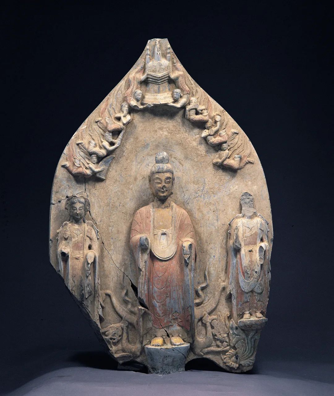 Gilded and painted stone sculptures of the Buddha and two bodhisattvas, Eastern Wei Dynasty (534-550) [Photo/Ordos Museum official WeChat account]