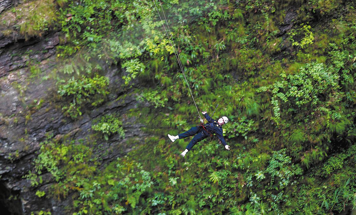 The Hou'er Tiankeng scenic area in Kaiyang county, a typical karst collapse sinkhole with a diameter of 300 meters and a depth of 280 meters, has been transformed into an extreme sports park.