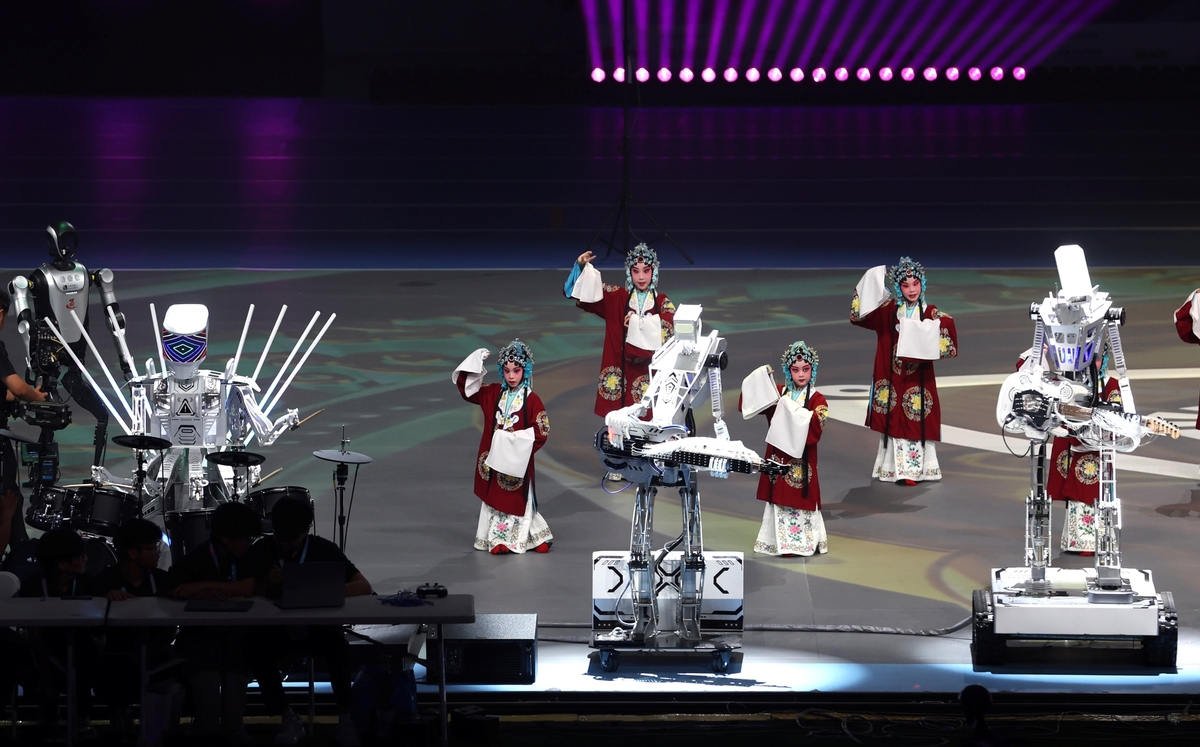 Sixty miniature robots dressed in opera costumes move with precision, while others demonstrate Tai Chi and Wing Chun in coordination with human acrobats, executing difficult stunts like single-leg stances and the "spreading wings" pose. [Photo by Zou Hong/chinadaily.com.cn]