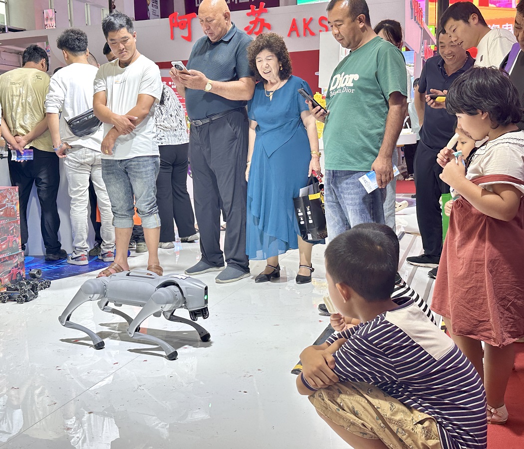 Visitors interact with a robot at the 15th Kashgar-Central and South Asia Commodity Fair, which began on Aug 15, 2025. [Photo by Zhao Ruixue/chinadaily.com.cn]