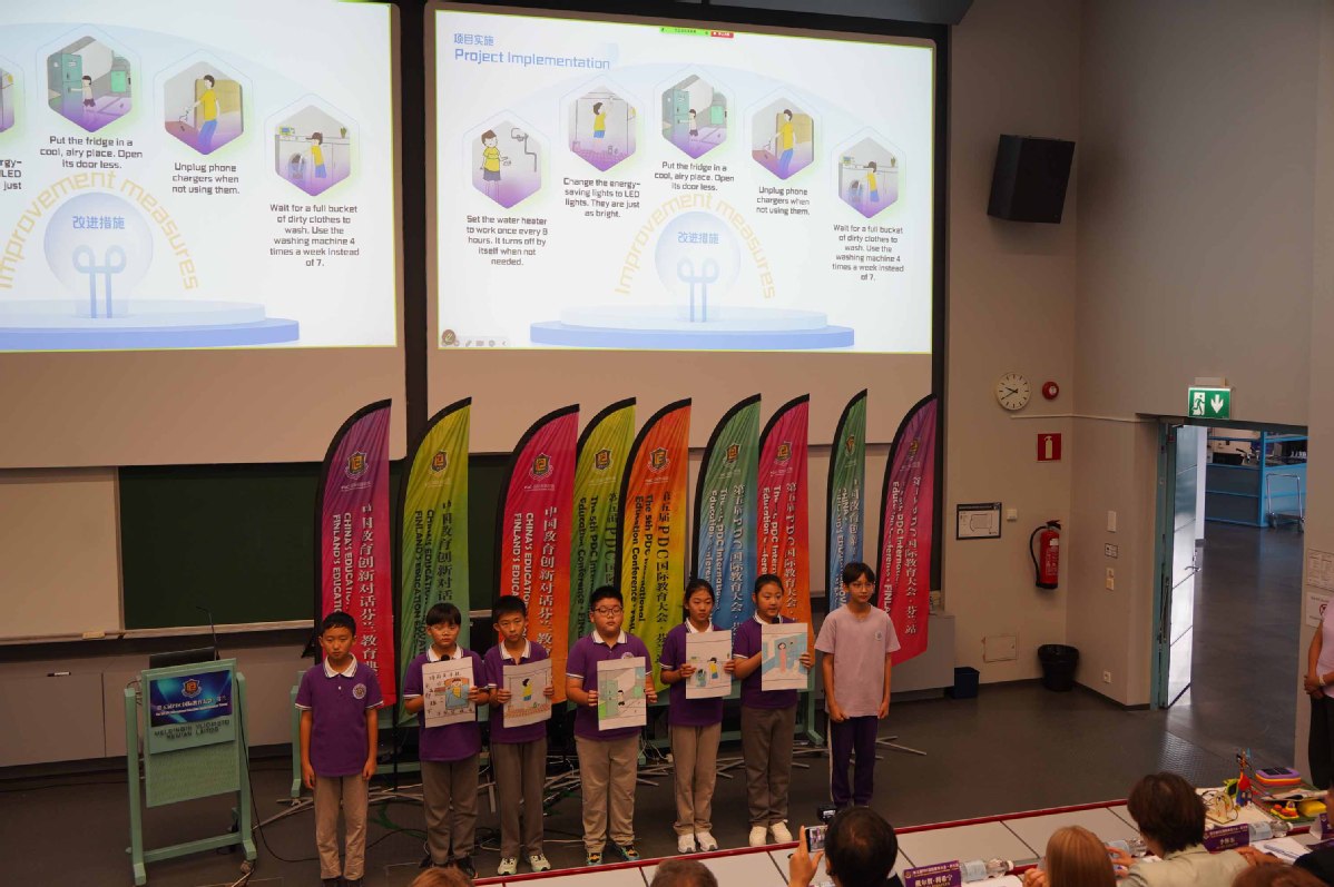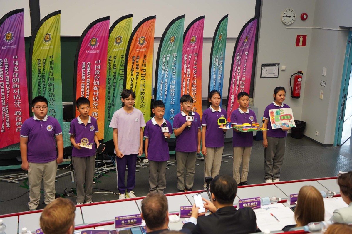 Students from Hujialou Central Primary School present a research project during the fifth PDC International Education Conference at the University of Helsinki in Finland on Friday. [Photo provided to chinadaily.com.cn]