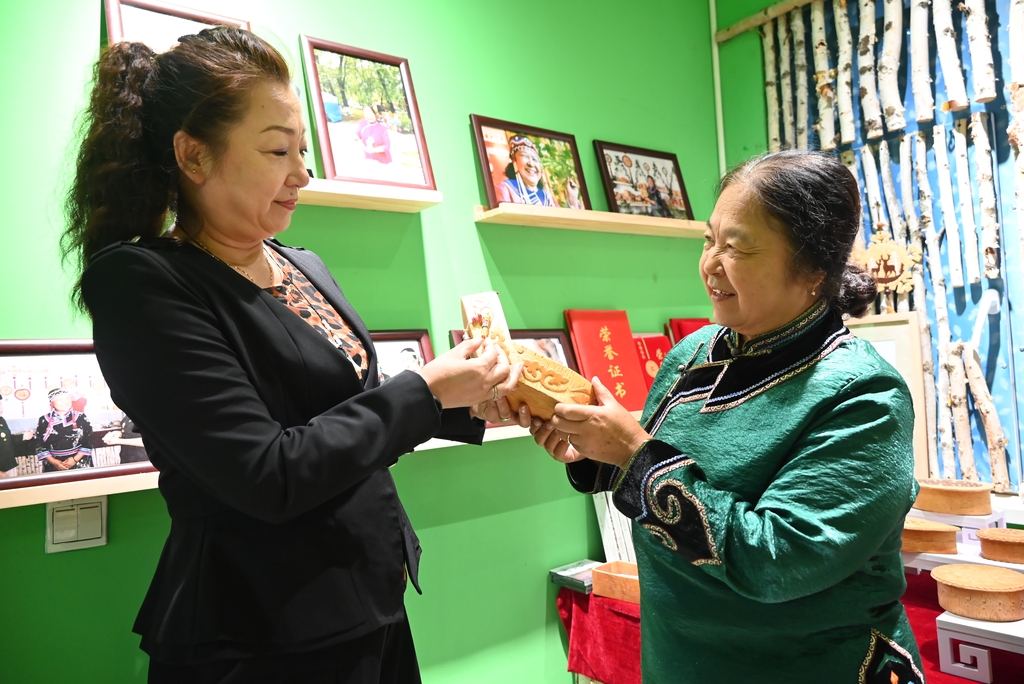 An Oroqen birch-bark craft inheritor (R) demonstrates a birch-bark artwork. [Photo/IC]