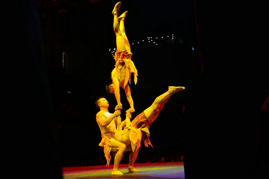 The Hunan Acrobatic Art Theater recently gave its 800th global tour performance of the original acrobatic drama Dream Journey — Mysterious Xiangxi in Torrelavega, Spain. [Photo provided to chinadaily.com.cn]