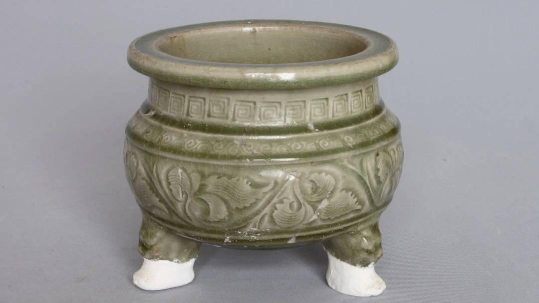 Celadon tripodal (three-footed) incense burner engraved with floral motifs, Jurchen Jin Dynasty (1115-1234) [Photo/Anyang Museum official WeChat account]