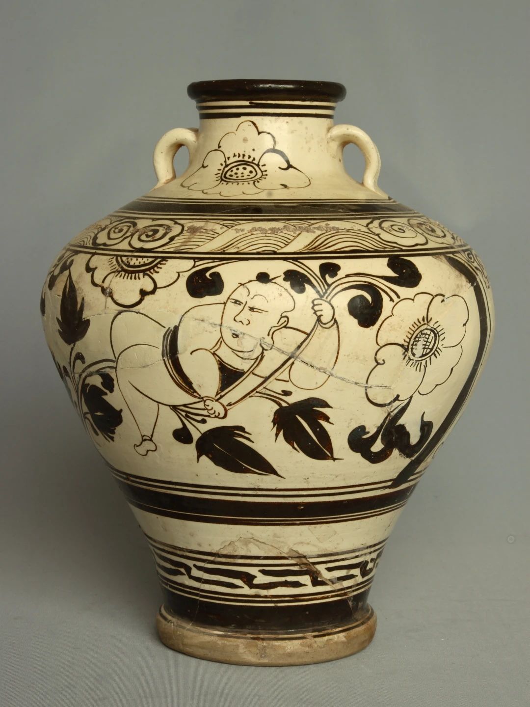 White-glazed vase with black motifs of a child playing with peonies, Ming Dynasty (1368-1644) [Photo/Anyang Museum official WeChat account]