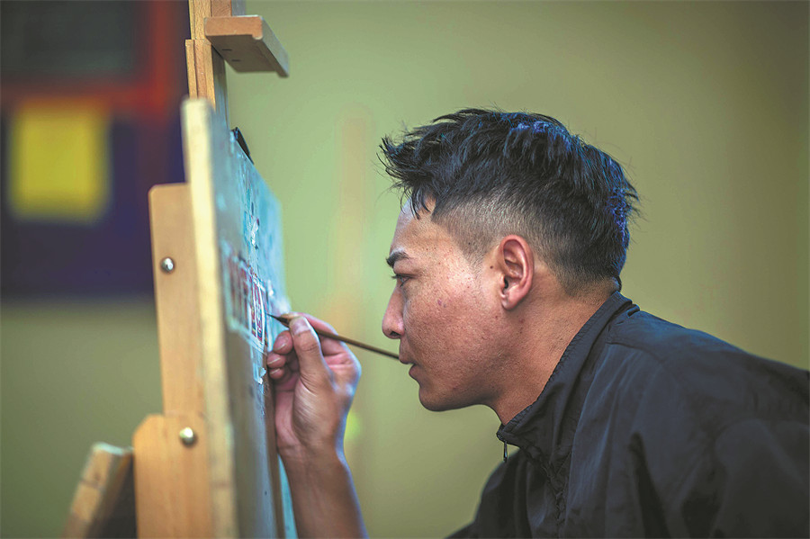 A young man concentrates on his thangka artwork. The art was included on the national intangible cultural heritage list in 2006. JIANG FAN/TENZING NIMA QADHUP/XINHUA