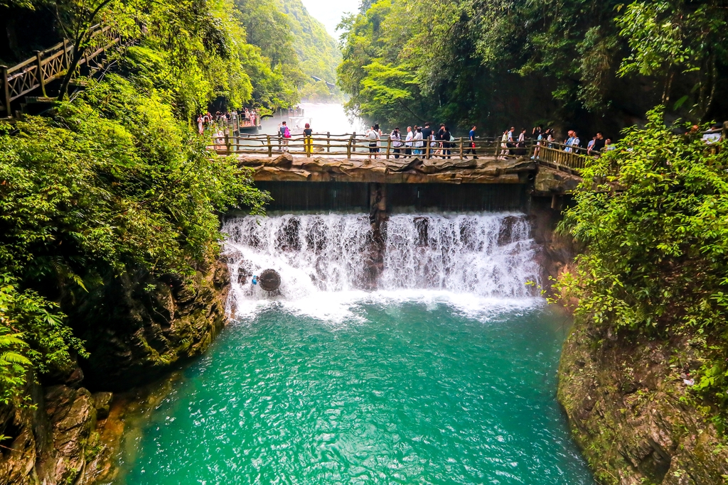 This summer, Pingshan Canyon in Enshi, Hubei province has surged in popularity due to its unique karst landscape and geological fissures, earning the nickname “China’s Semporna”. Tickets are selling out rapidly amid soaring demand. Utilizing an efficient boat-in-boat-out travel model, visitors glide through narrow passages flanked by towering cliffs aboard small wooden boats.