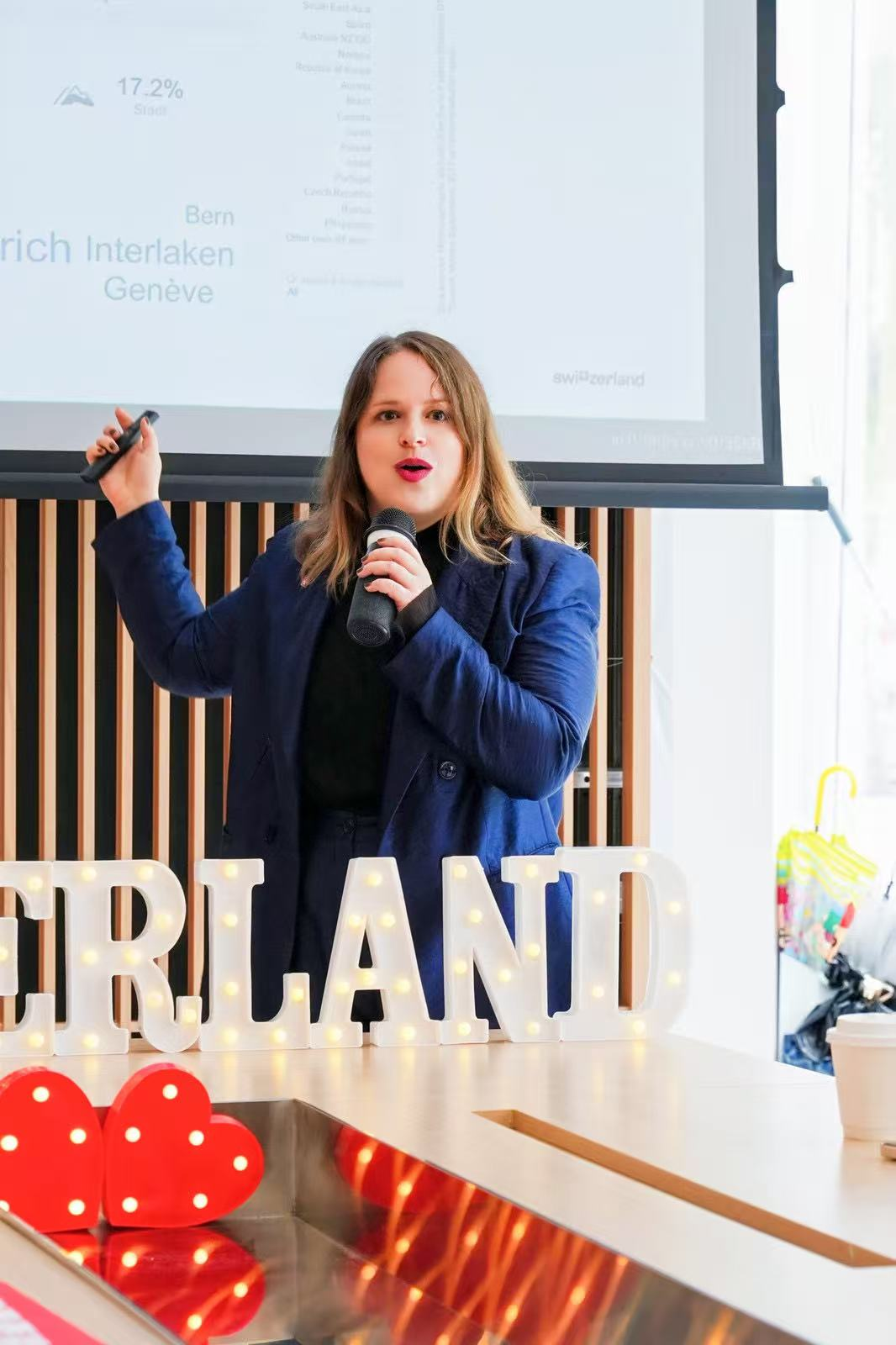 Daniela Chiani, the Greater China Director at Switzerland Tourism, gives a speech at the media conference. [Photo provided to chinadaily.com.cn]