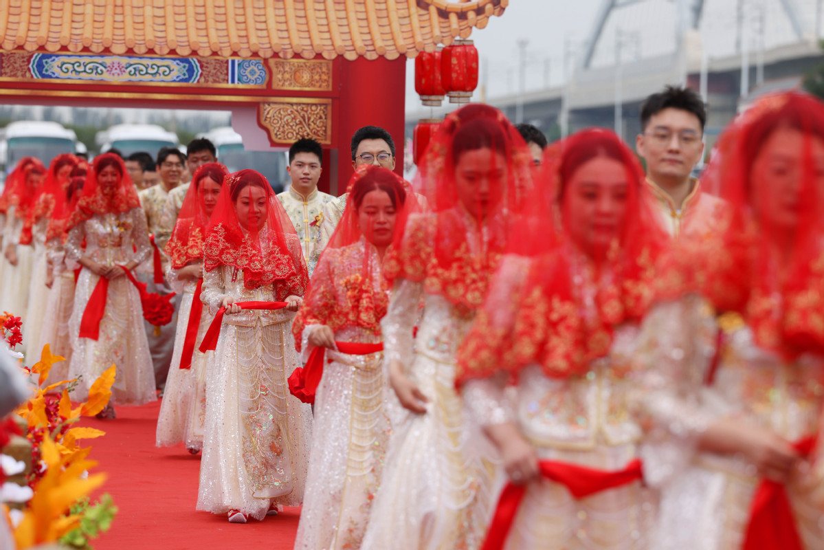 China Railway Taiyuan Group Co Ltd in Taiyuan, Shanxi province, hosts a Chinese-style group wedding on Qixi Festival, widely regarded as China's Valentine's Day, on Aug 29, 2025. [Photo by Zhu Xingxin/chinadaily.com.cn]
