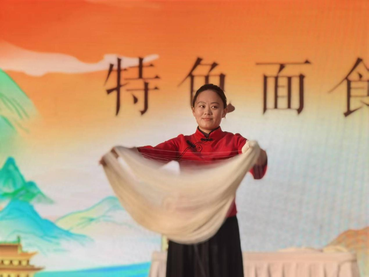 A Shanxi chef presents traditional Lamian noodle-making skills during the activity. [Photo provided to chinadaily.com.cn]
