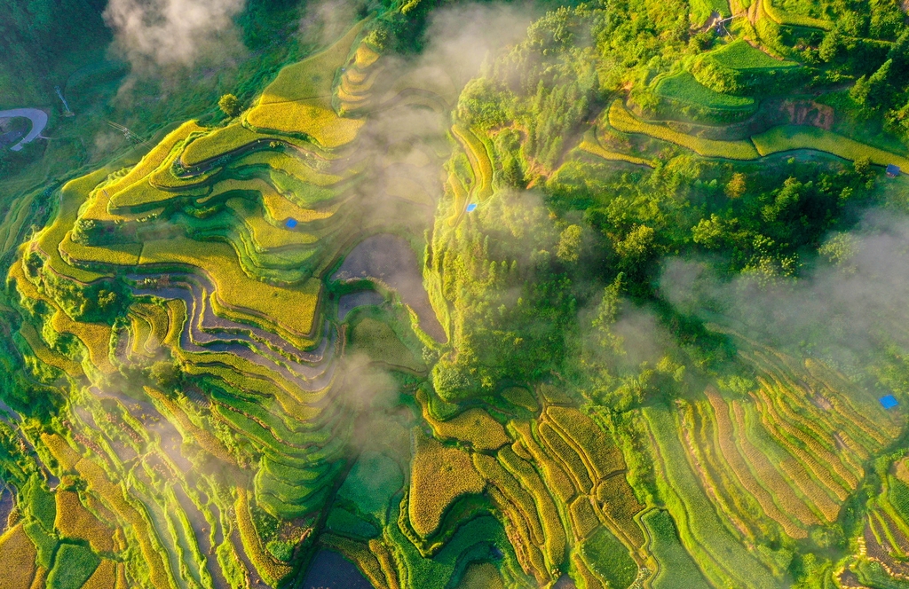 In the high mountain areas of Rongshui Miao autonomous county, Guangxi Zhuang autonomous region, layer upon layer of colorful terraced fields, shrouded in mist and clouds, blend harmoniously with golden rice, rustic dwellings, and lush green mountains, creating a picturesque scene.