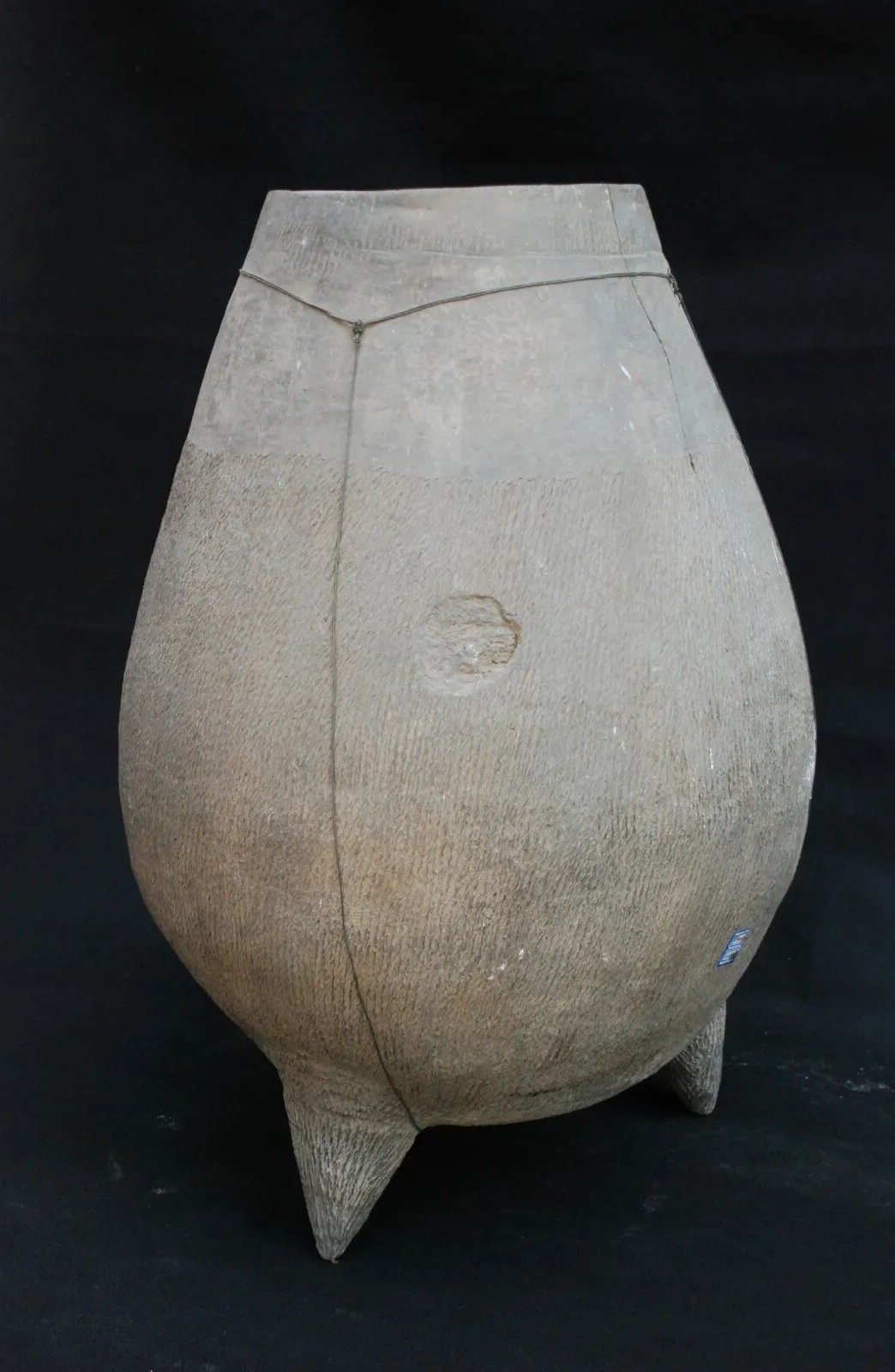 This Neolithic grey pottery urn, with its tripod base, ovoid (egg-shaped) belly and cord marking decoration, often served as a burial vessel millennia ago. Similar urns have been unearthed since the 1950s in sites across Shanxi, southern Inner Mongolia and northeastern Shaanxi. This piece is housed in the Taiyuan Museum in Shanxi province.