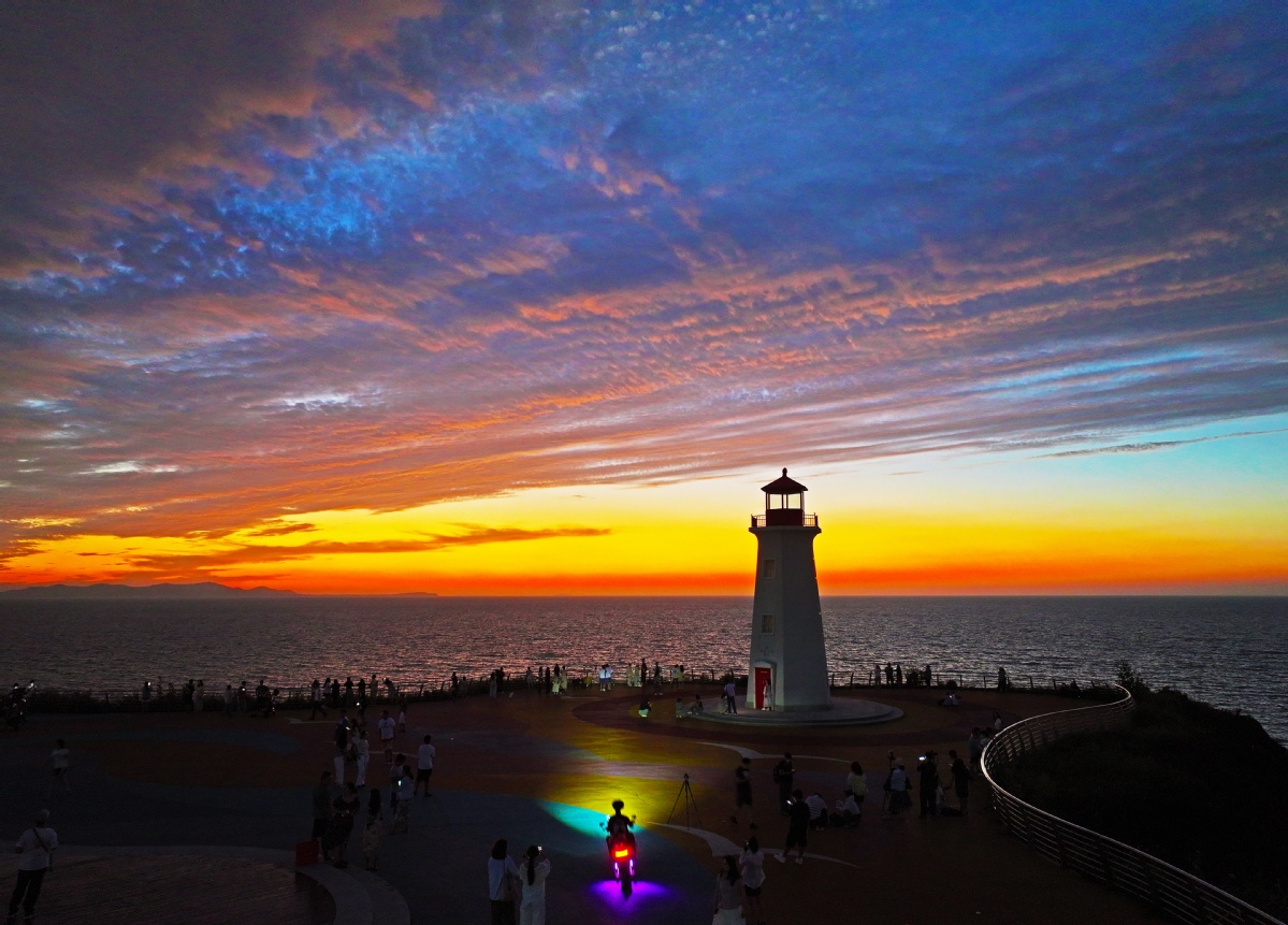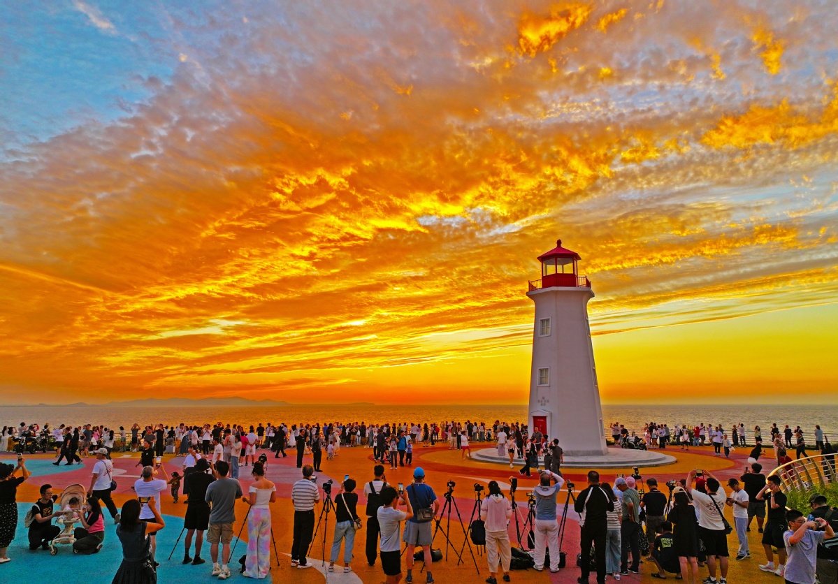 At Boxia Bay in Dalian, Liaoning province, the lighthouse appears particularly magnificent against the fiery evening glow. As dusk approaches, the sky burns with a vibrant red, like a passionate dance of light and color across the horizon.
