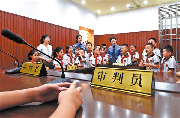 Two prosecutors teach legal knowledge to primary school students through a moot court at a legal education base for juveniles in Yiyuan county, Shandong province, on Sept 5. ZHAO DONGSHAN and YOU KUIKUI/FOR CHINA DAILY