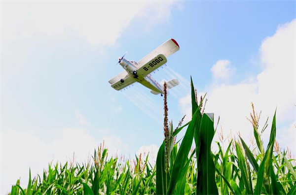 An agricultural aircraft flies above a corn field at the Zhaoguang Farm under the Beidahuang Group Bei'an branch in Bei'an city, Northeast China's Heilongjiang province, July 25, 2025. [Photo/Xinhua]